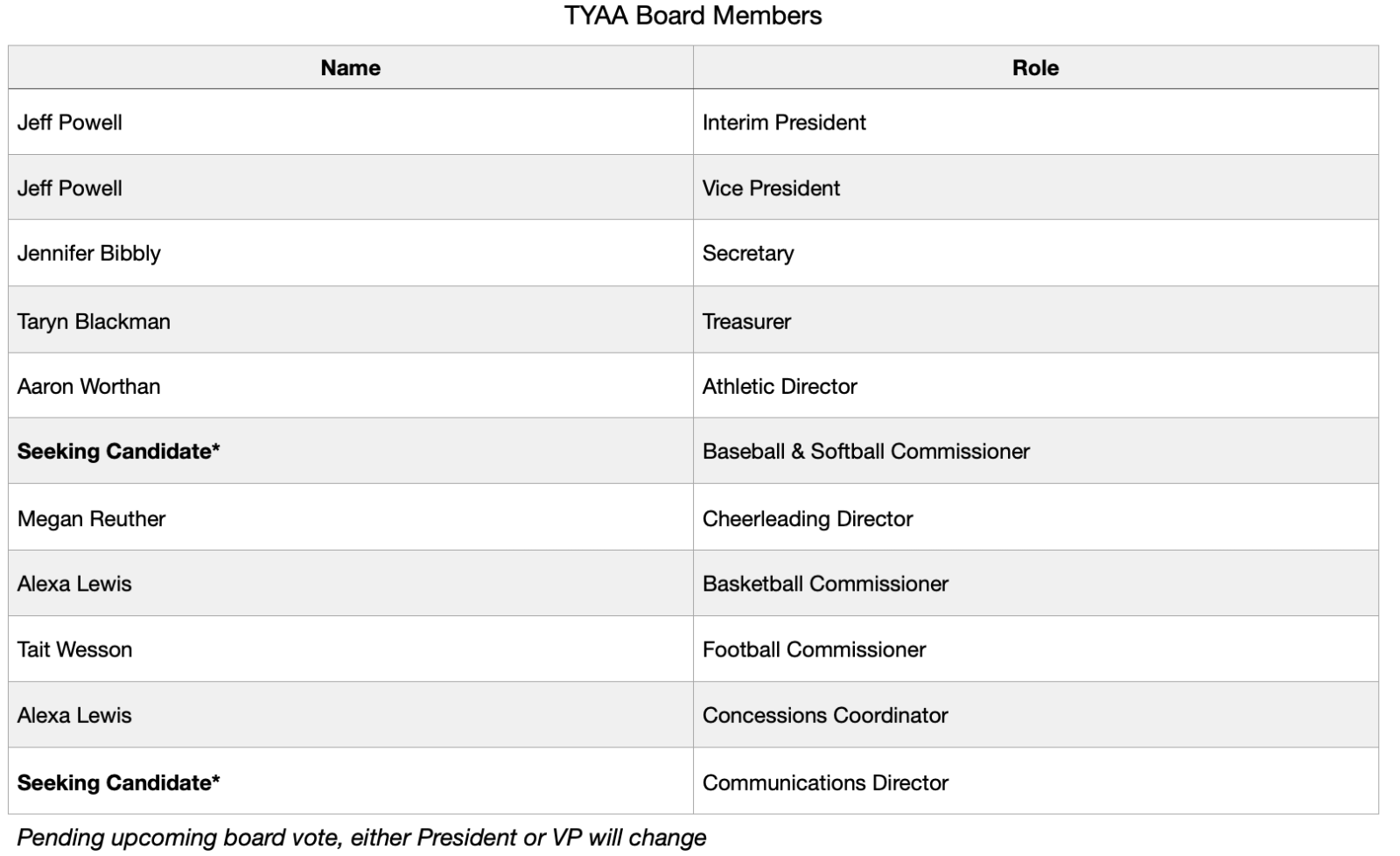 The table below lists the key personnel responsible for the Tolar Youth Athletic Association web site.