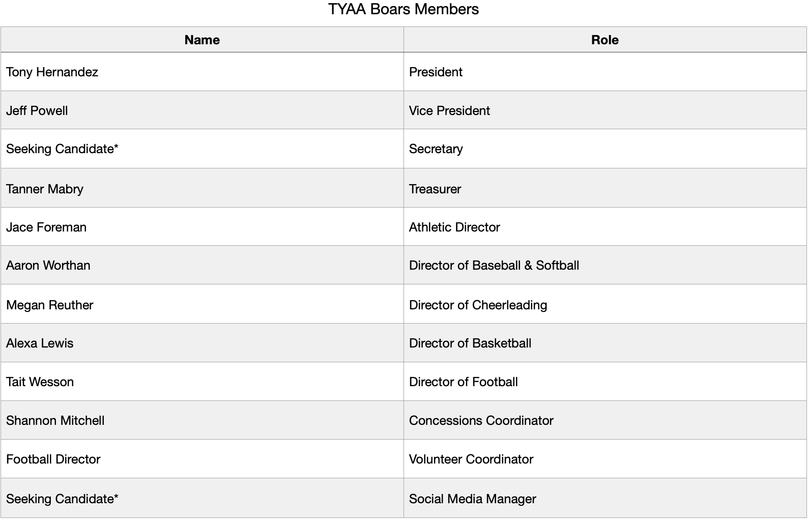 The table below lists the key personnel responsible for the Tolar Youth Athletic Association web site.